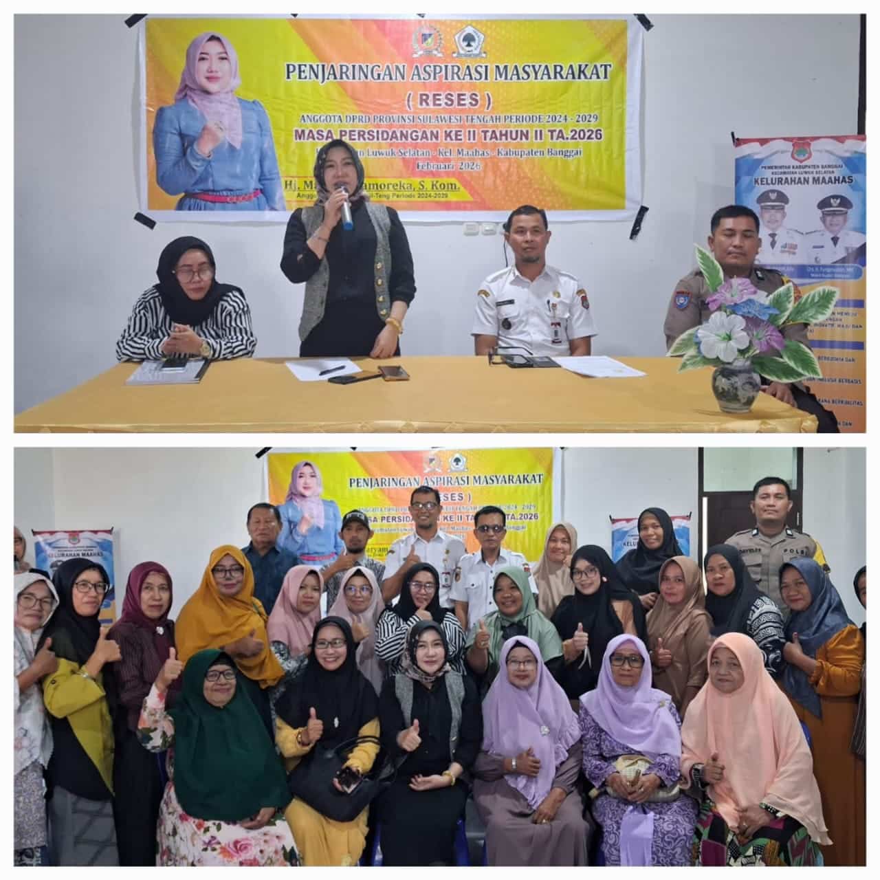 Banggai Three Fakta News-Anggota Dewan Perwakilan Rakyat Daerah (DPRD) Provinsi Sulawesi Tengah (Sulteng), Hj. Mariam Tamoreka, S. Kom., menggelar reses masa persidangan ke II, Tahun Anggaran 2026, dalam penjaringan aspirasi masyarakat, di Kantor Lurah Mahaas, Kecamatan Luwuk Selatan, Kabupaten Banggai, Rabu (11/2/2026).