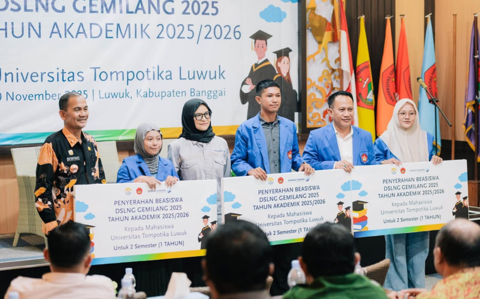 Banggai Three Fakta News-PT Donggi Senoro LNG, memberikan beasiswa pendidikan kepada 18 Mahasiswa Universitas Tompotika (Untika) Luwuk, dalam mendukung program prioritas Pemerintah Kabupaten (Pemkab) Banggai di bidang pendidikan, di Rektorat Untika Luwuk, Kamis (20/11/2025).