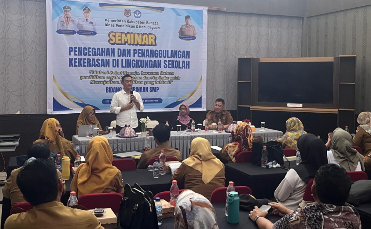 Banggai Three Fakta News-Kasat Narkoba Polres Banggai AKP Hasanuddin Hamid, menjadi narasumber dalam seminar pencegahan dan penangulangan kekerasan dilingkungan Sekolah, di salah satu hotel di Luwuk, Selasa (7/10/2025).