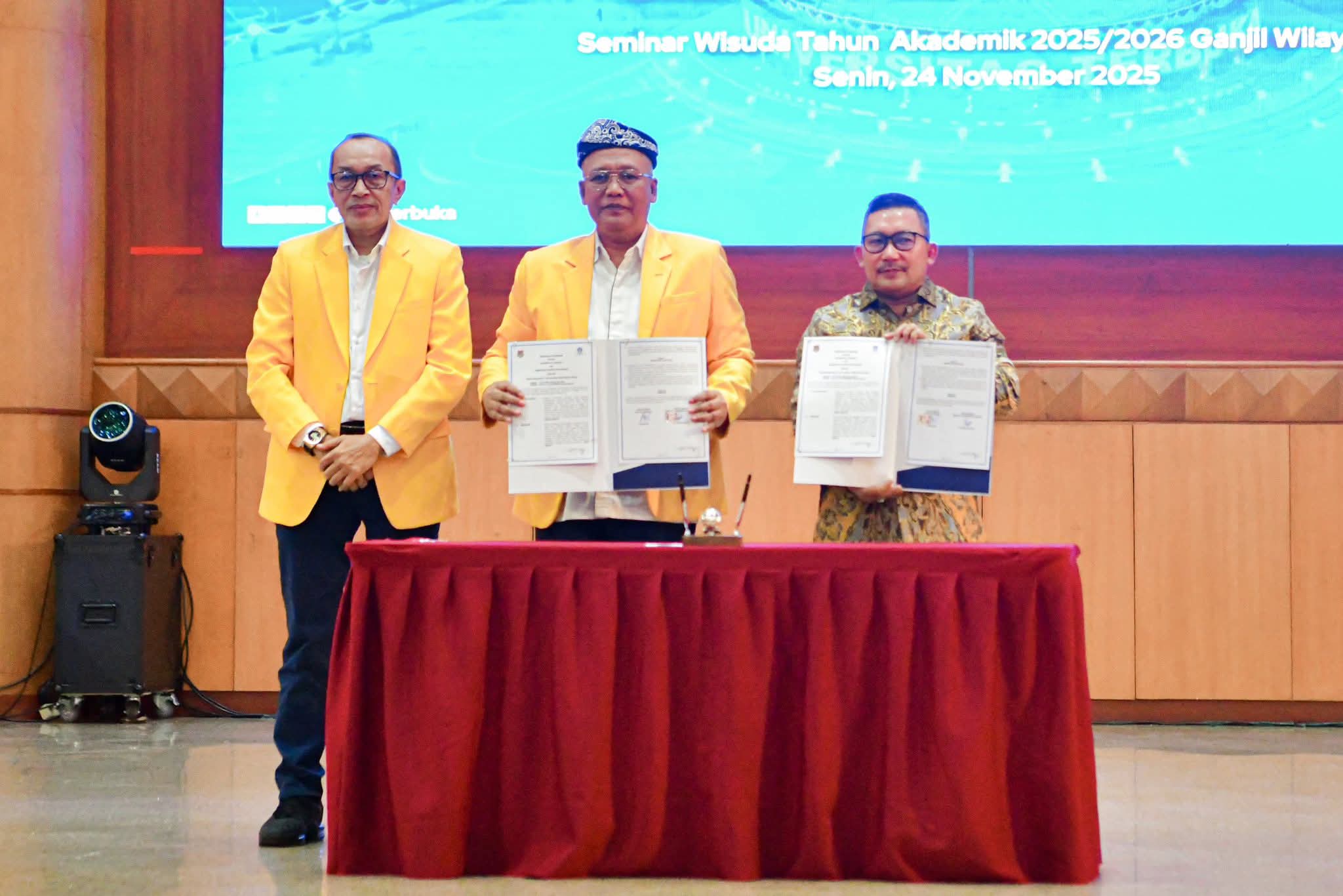 Tangerang Three Fakta News-Bupati Banggai, H. Amirudin Tamoreka bersama Rektor Universitas Terbuka (UT) Tangerang Selatan, menandatangani Memorandum Of Understanding (MoU), terkait penyelenggaraan perguruan tinggi di Kabupaten Banggai, di UT Convention Center, Tangerang Selatan, Senin (24/11/2025).