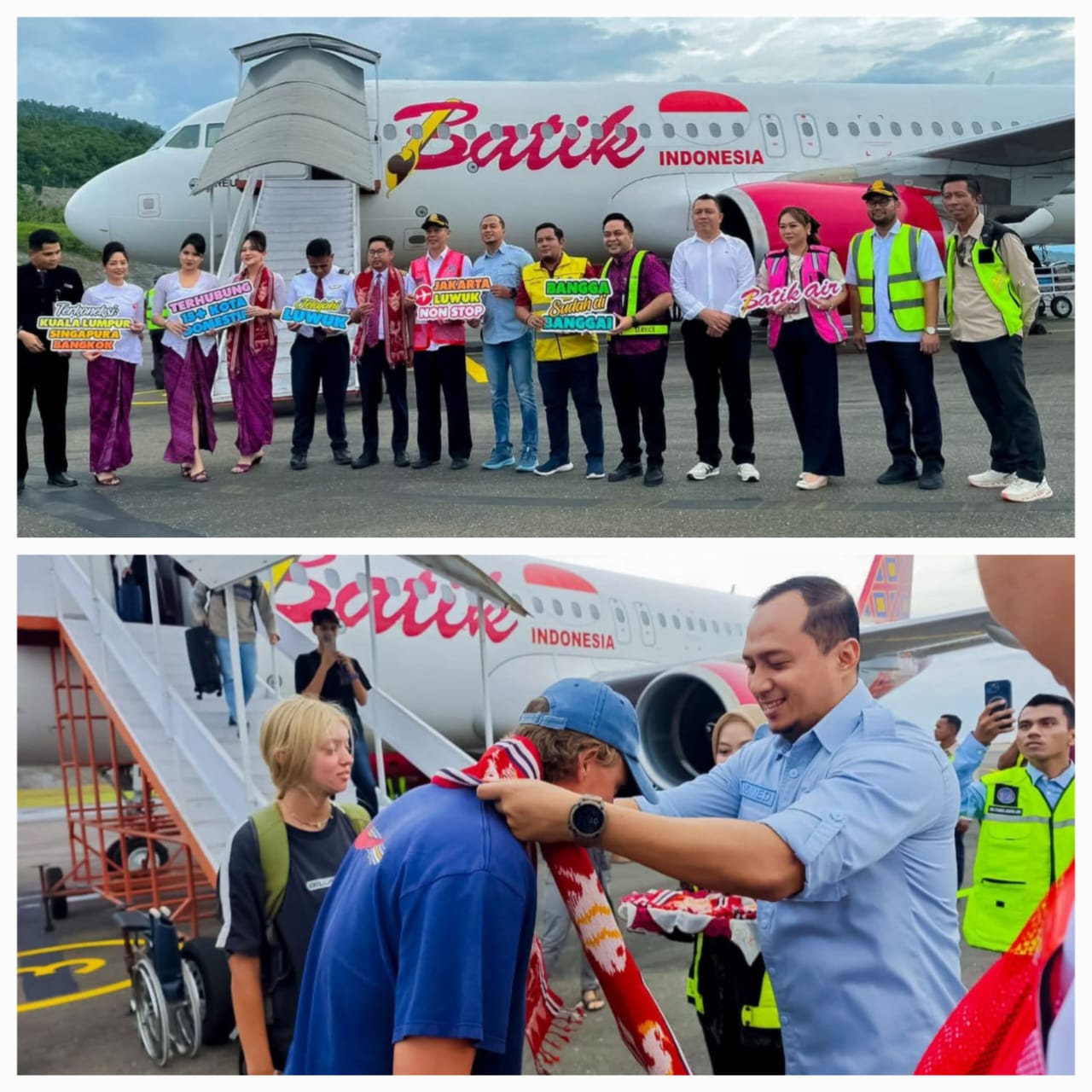 Bupati Banggai, diwakili Kepala Dinas (Kadis) Pariwisata Ismed M. Wardhana, menyambut kedatangan pesawat Airbus 320 generasi modern milik Batik Air, dalam penerbangan perdananya dari Bandara Soekarno-Hatta (CGK), di Bandara Syukuran Aminuddin Amir, Luwuk Selatan, Sabtu (14/3/2026).