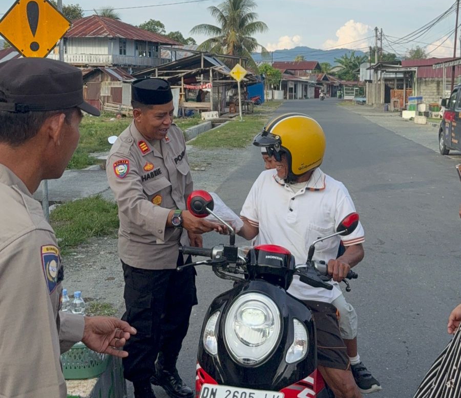 Touna Three Fakta News-Satuan Pembinaan Masyarakat (Sat Binmas) Polres Tojo Una-Una (Touna) menggelar program Jumat Berkah, dengan memberikan makanan gratis kepada warga dan penggendara yang melintas, di Jalan Kerapu, Kelurahan Muara Toba, Kecamatan Ratolindo, Kabupaten Touna, Jumat (17/10/2025).