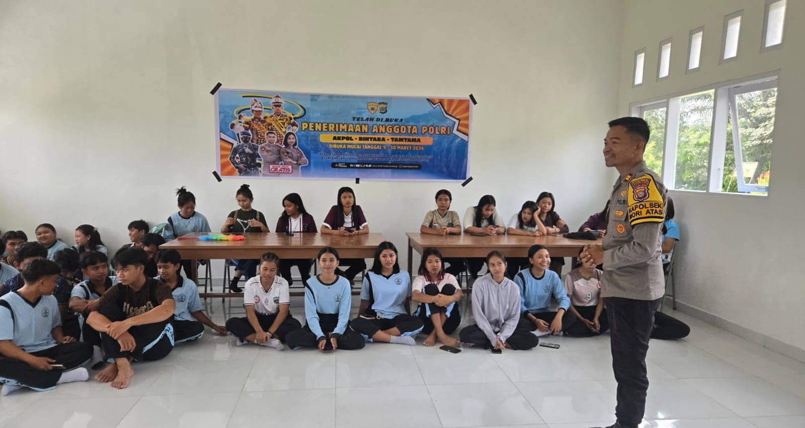 Morut Three Fakta News-Kapolsek Mori Atas, Iptu Saparuddin, menyosialisasikan penerimaan terpadu anggota Polri Tahun Anggaran 2026 kepada siswa-siswi kelas XII SMA Negeri 1 Mori Atas, di ruang Perpustakaan SMAN 1 Mori Atas, Kabupaten Morowali Utara (Morut), Jumat (13/3/2026).
