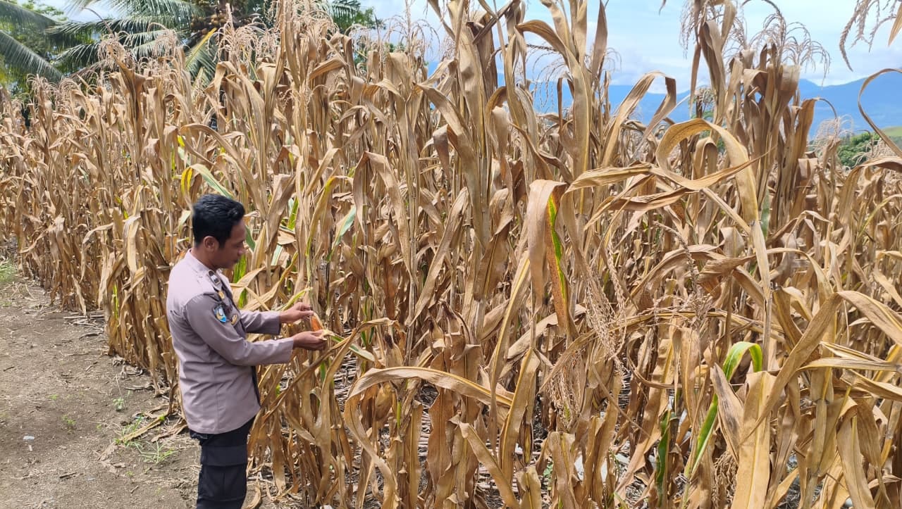 Touna Three Fakta News-Dalam mendukung program ketahanan pangan nasional, Bhabinkamtibmas Polsek Ampana Kota, Bripka Andrias Sigar melakukan monitoring aktivitas panen jagung milik warga, di Kelurahan Uentanaga Atas, Kecamatan Ratolindo, Kabupaten Tojo Una-Una (Touna), Senin (5/1/2026).
