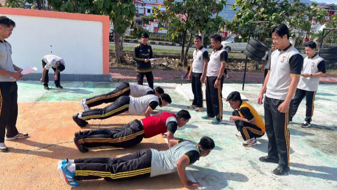 Terlihat, para personel menjalani serangkaian uji fisik, mulai dari lari statis/lapangan hingga berbagai gerakan penguatan fisik lainnya yang telah menjadi standar penilaian kepolisian.