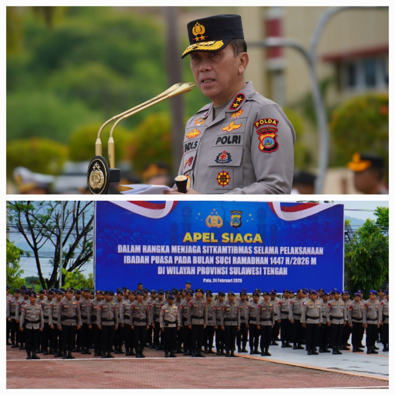 Palu Three Fakta News-Kepala Kepolisian Daerah (Kapolda) Sulawesi Tengah (Sulteng) Irjen Pol Dr Endi Sutendi, memimpin apel siaga bersama Forkopimda dalam rangka menjaga Kamtibmas selama pelaksanaan ibadah puasa Ramadhan 1447 H/2026 M, di Mapolda Sulteng, Selasa 24/02/2026.