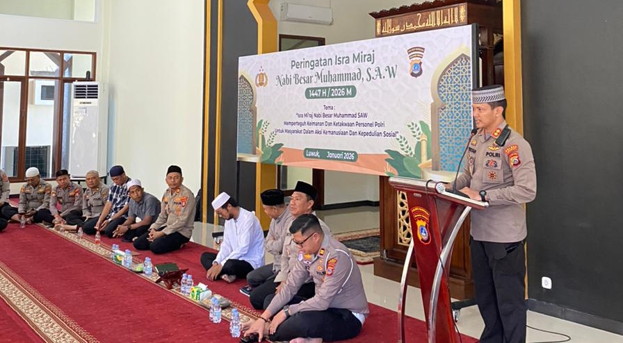 Banggai Three Fakta News-Kapolres Banggai AKBP Wayan Wayracana Aryawan, menghadiri Tabligh Akbar dalam rangka peringatan Isra’ Mi’raj Nabi Muhammad SAW 1447 H / 2026 M, di Masjid Ar-Rahman Mapolres Banggai, Kamis (15/01/2026).