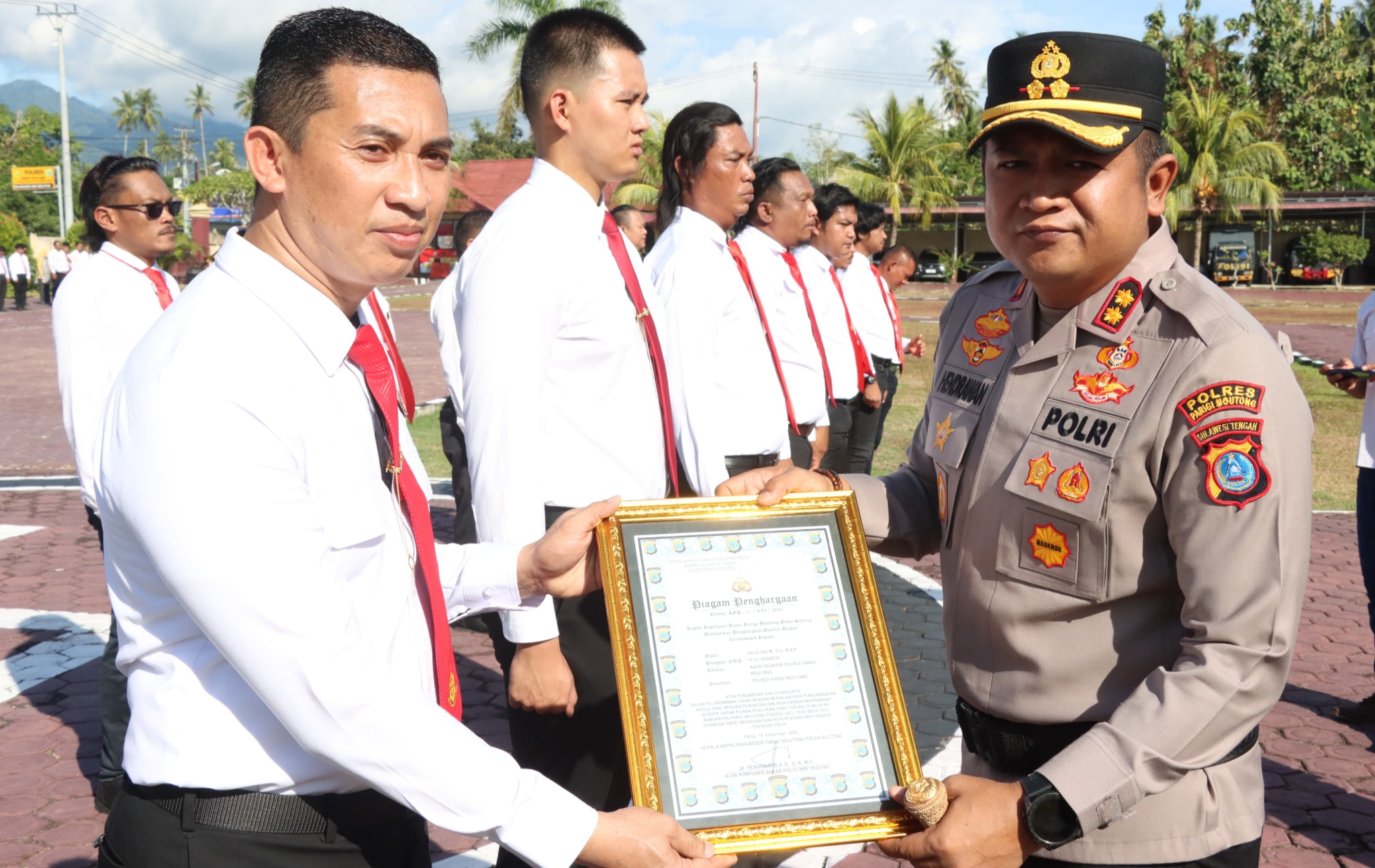 Parimo Three Fakta News-Kapolres Parigi Moutong (Parimo) AKBP Dr. Hendrawan A. N, memberikan piagam penghargaan kepada personel Satuan Reserse Kriminal (Satreskrim) dan Satuan Reserse Narkoba (Satresnarkoba), atas dedikasi dan kinerja yang ditorehkan dalam pengungkapan berbagai kasus kriminal dan peredaran narkoba, di halaman Mapolres Parimo, Senin (15/12/2025).