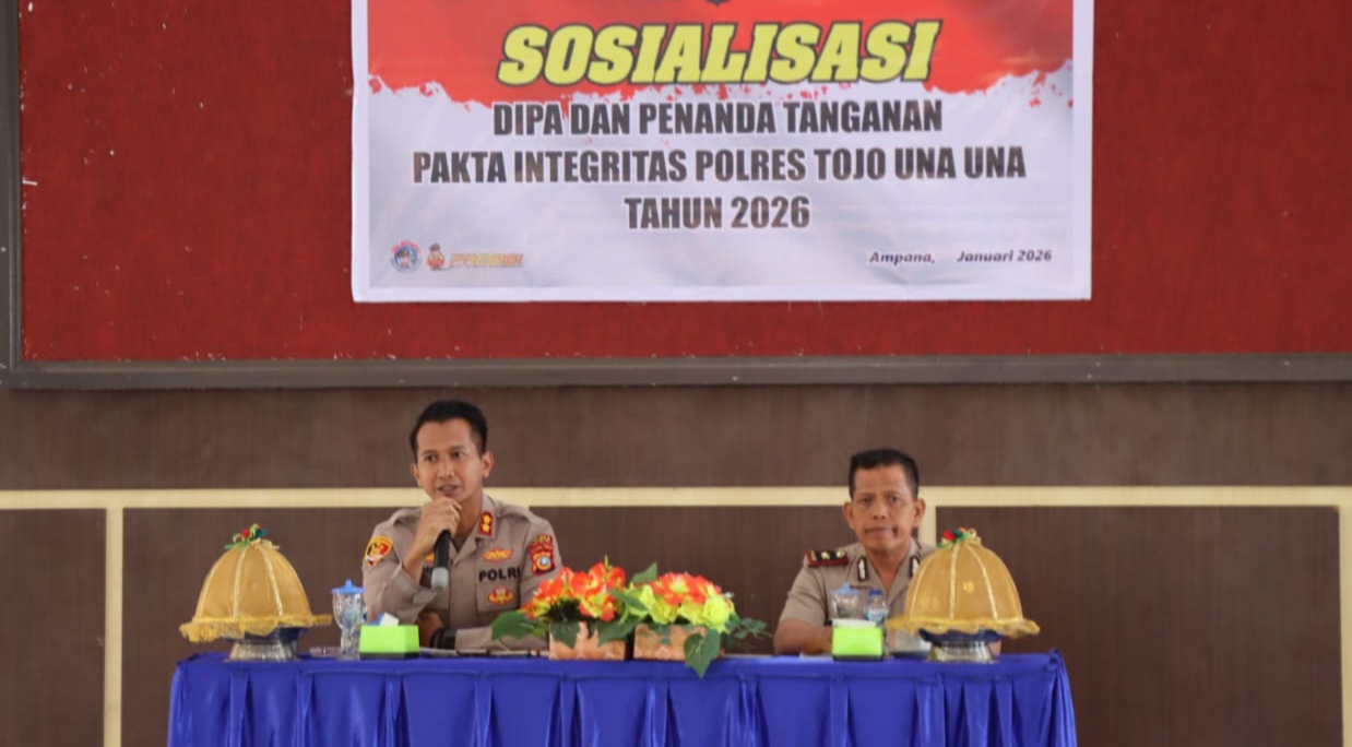 Touna Three Fakta News-Kapolres Touna, AKBP Yanna Djayawidya, sosialisasikan Daftar Isian Pelaksanaan Anggaran (DIPA) tahun 2026, dan penandatanganan pakta tntegritas, di aula Endra Darmalaksana Mapolres Touna, Senin (12/1/2026).