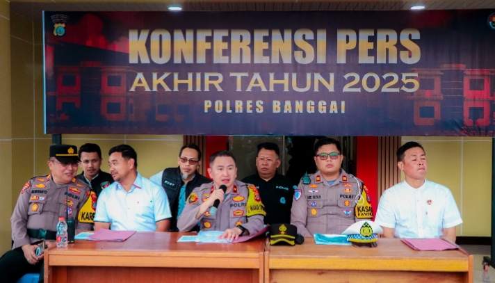Banggai Three Fakta News-Polres Banggai menggelar konferensi pers akhir tahun 2025 hasil kinerja selama setahun di Mapolsek Luwuk, Rabu (31/12/2025)