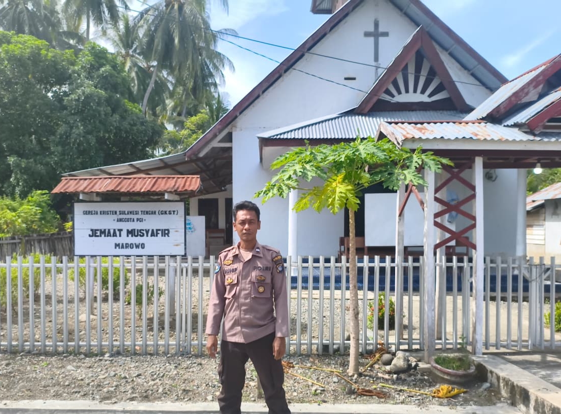 Touna Three Fakta News-Aparat Personel Polsek Ulubongka Polres Tojo Una-Una (Touna), menggelar patroli rutin saat umat Kristiani melaksanakan ibadah Minggu, di Gereja GKST dan GPDI Desa Marowo, Kecamatan Ulubongka, Kabupaten Touna, Minggu (30/11/2025).
