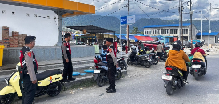 Banggai Three Fakta News-Satuan Samapta Polres Banggai, melakukan patroli dengan cara jalan kaki, untuk mengantisipasi gangguan Kamtibmas selama bulan Ramadhan, di Pasar Tradisional Simpong Luwuk, Kabupaten Banggai, Selasa (24/2/2026).